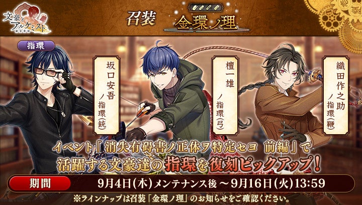 召装『金環ノ理』のラインナップを更新いたしました。この召装では、イベント『文史紀伝「消失有碍書ノ正体ヲ特定セヨ 前編」』で活躍する「坂口安吾」「織田作之助」「檀一雄」の指環を一定の確率で入手できます。