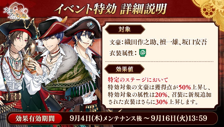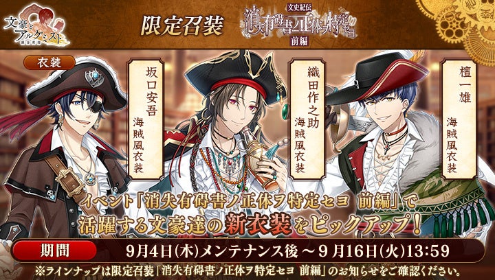 さらに、イベントと同時に開催される限定召装『消失有碍書ノ正体ヲ特定セヨ 前編』にて新規追加された「坂口安吾」「織田作之助」「檀一雄」の〈海賊風衣装〉を編成すると、得点の獲得率がそれぞれ30%上昇します。