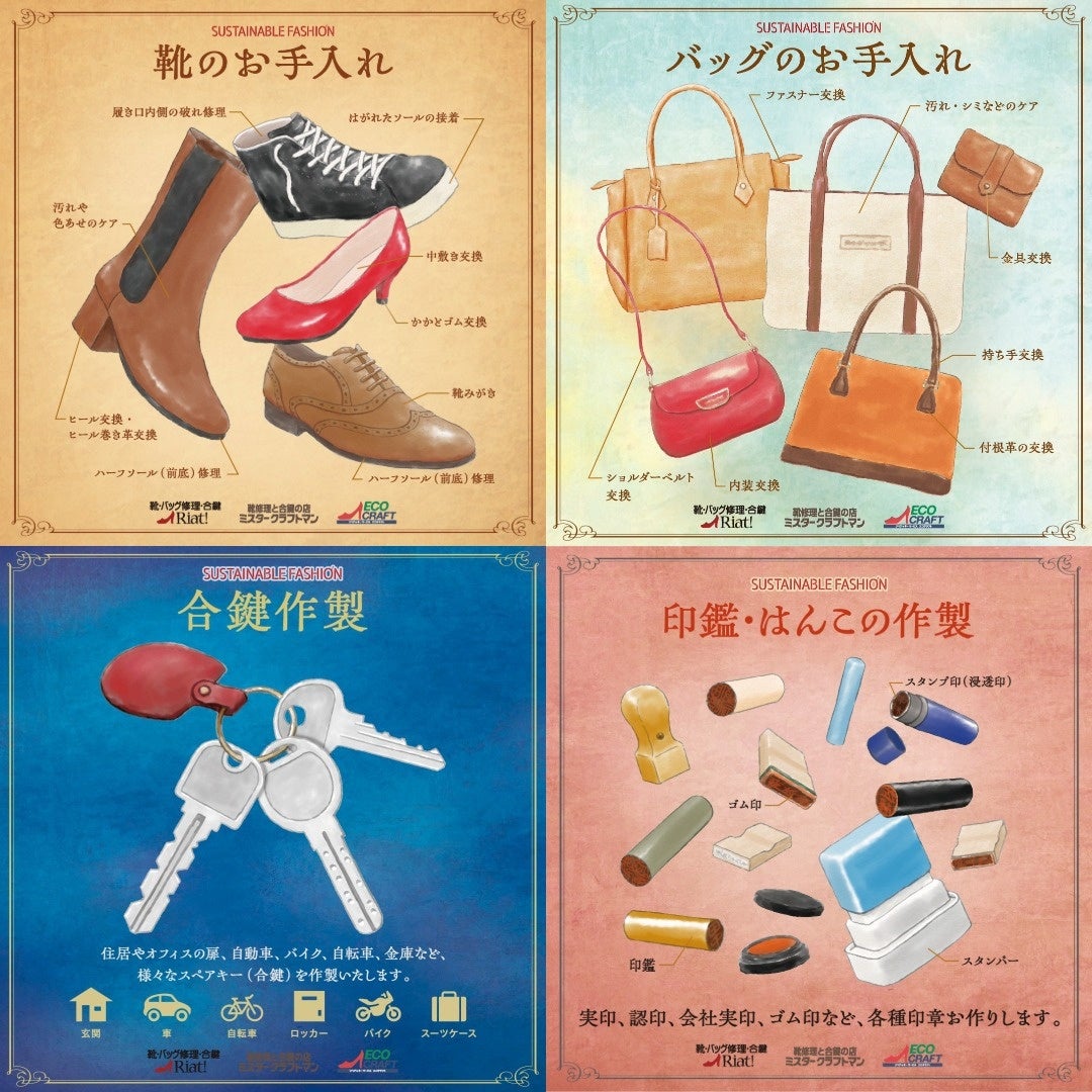 靴修理、靴クレンジング&ケア、バッグ修理、バッグクレンジング&ケア、靴・バッグケア用品販売、