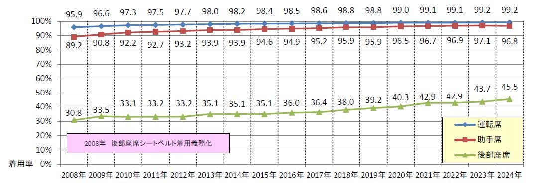 一方で、運転席の着用率は一般道路で99.2%(前年同値)、高速道路等で99.6%(前年同値)、助手席においてもそれぞれ95%を超える結果となりました。