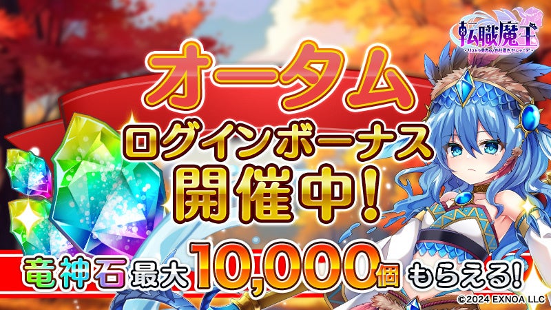 オータムキャンペーンとして、ガチャやスタミナ回復に利用できる「竜神石」や強化アイテムが手に入るログインボーナスを実施しています。開催期間中毎日ログインすると、合計10,000個の「竜神石」を獲得できます。毎日忘れずにログインしましょう!