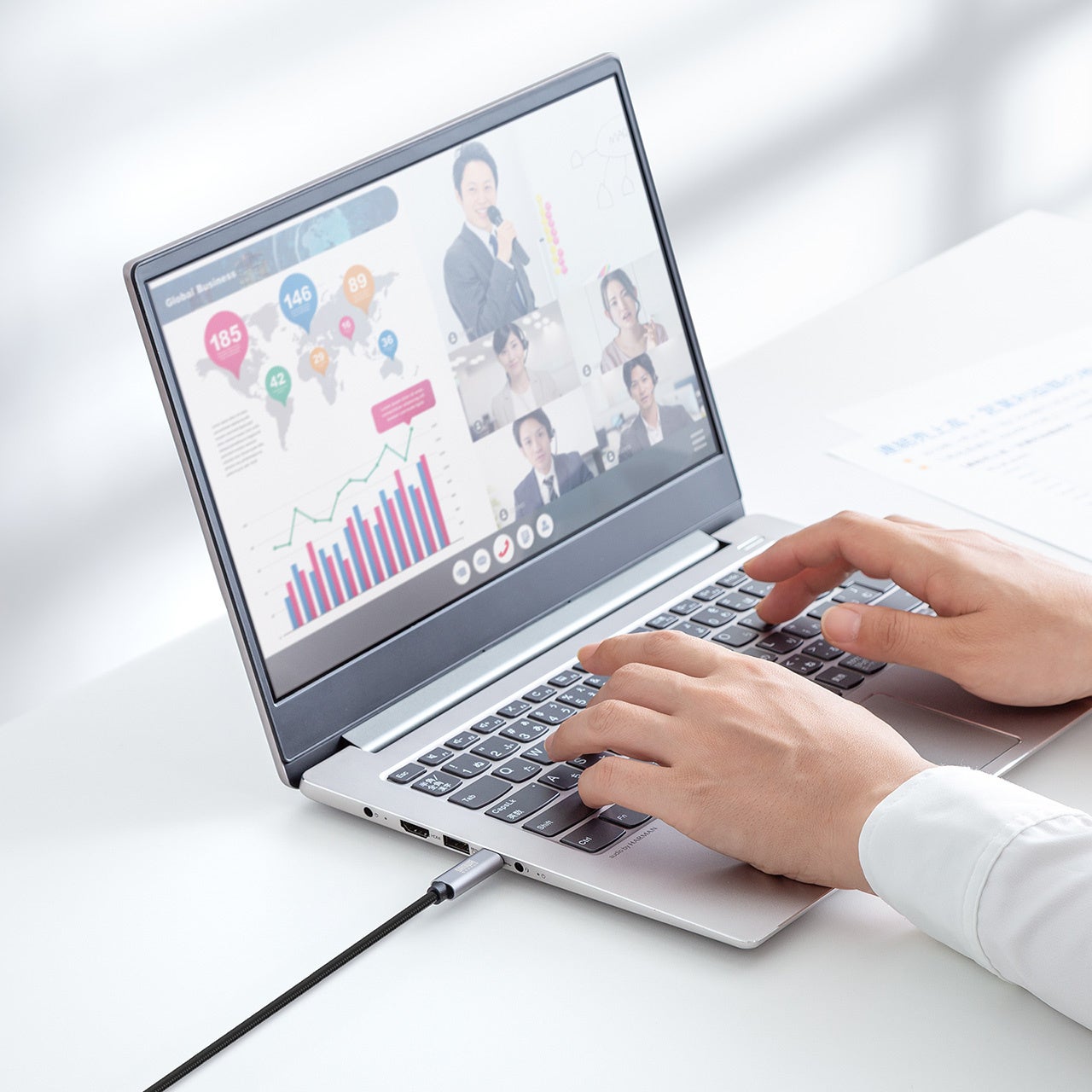 最大100Wという高出力のUSB Power Deliveryに対応しているため、消費電力の大きいハイエンドなノートPCでも、作業しながらフルスピードで充電が可能です。オンライン会議や大容量データのダウンロードなど、バッテリー消費の激しいシーンでも残量を気にすることなく、常にパフォーマンスを維持できます。