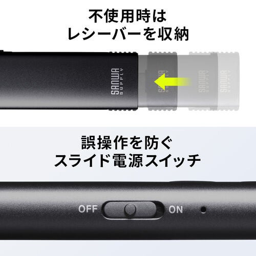 本体には、ポインター照射、ページ送り・戻り、ブラックアウトなどの主要機能を割り当てた4つのボタンを配置。手に馴染むスリムなスティック形状で、直感的な操作をサポートする。また、レシーバーは本体内に磁石で固定して収納できるため、持ち運びの際の紛失を防ぎ、スマートに管理できる。