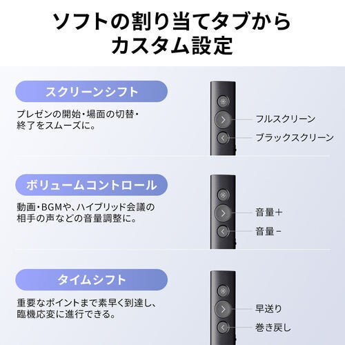 最新のOS環境に対応しており、幅広いデバイスで活用可能である。電源は便利なUSB Type-C充電式を採用し、約2時間の充電で最大30時間の連続動作が可能。乾電池を買い置きする手間やコストを削減でき、環境にも配慮した設計となっている。ビジネスの現場を支える、次世代のプレゼンツールである。
