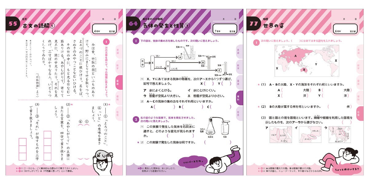 各ページの下には学習に役立つアドバイスやミニ知識、ゆるかわいいキャラクターたちによる応援コメント付きで、勉強が苦手でも楽しく続けられます。