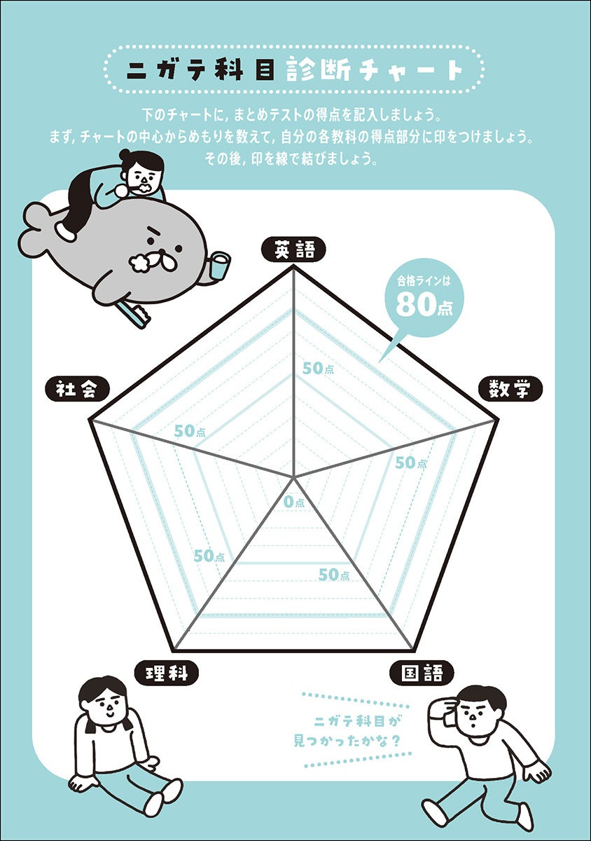 各教科の「まとめテスト」の得点記入で、ニガテ科目が一目でわかる「ニガテ科目診断チャート」付き!