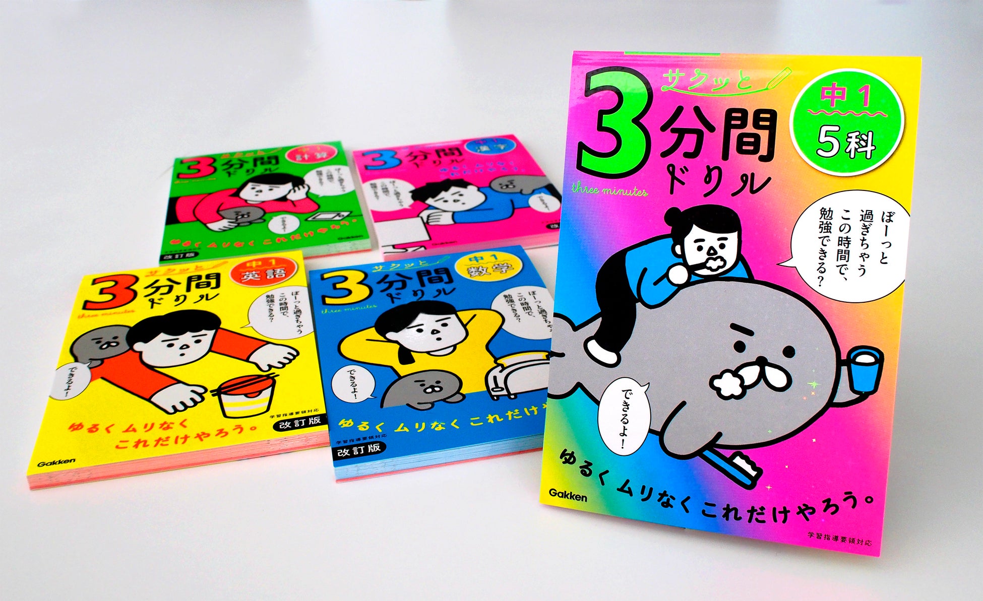 ゆるい見た目でも中身は本格派。1回たった3分、英語・数学・国語・理科・社会の5教科すべてを1冊で効率学習! 日々忙しい令和の中学生に贈る、『サクッと3分間ドリル』「中1 5科」が発売。