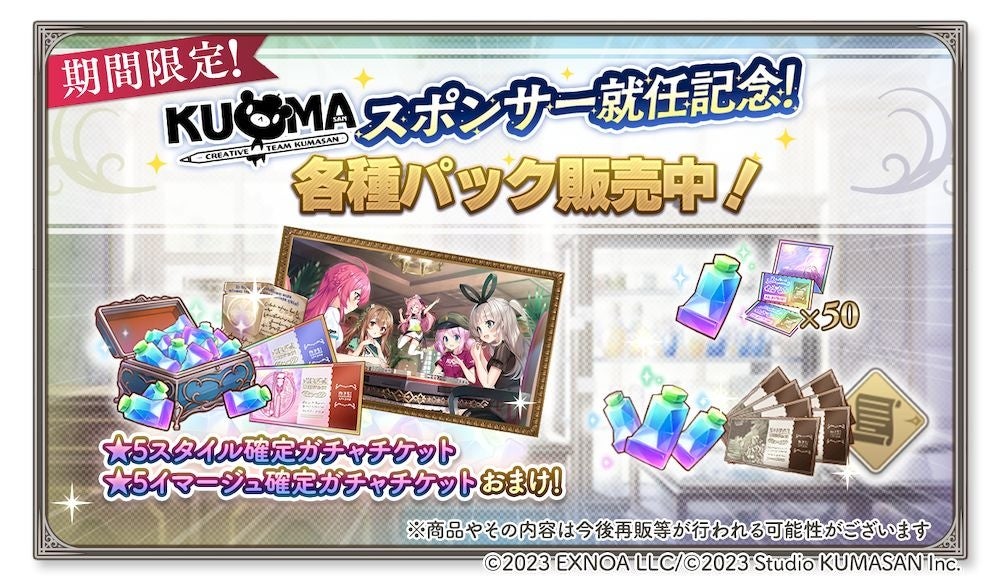 「クリエイティブチームくまさん」スポンサー就任記念として、特別なメモリーが付いた期間限定パック等の販売や最大1,500藝晶石がもらえるログインボーナスを開催いたします。