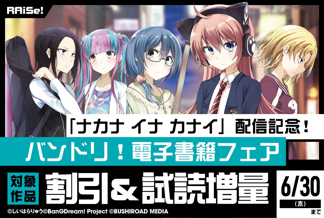 株式会社ブシロード(本社:東京都中野区、代表取締役社⻑:橋本義賢、以下ブシロード)のグループ会社にあたる株式会社ブシロードメディア(本社:東京都中野区、代表取締役社長:成田耕祐)は、本日6月20日(月)より『「ナカナ イナ カナイ」配信記念!バンドリ!電子書籍フェア』を開始することをご案内致します。紙版単行本「RAiSe! The story of my music」1巻【CD付き特装版】に付属していた楽曲「ナカナ イナ カナイ」が、本日より音楽配信サイト各社で配信開始されました。こちらを記念して、漫画作品「RAiSe! The story of my music」をはじめとする「バンドリ!(BanG Dream!)」関連電子書籍の割引販売、試読増量等を行います。ぜひこの機会に、気になっていた作品をお買い求めください。皆様におかれましては是非誌面・Web記事等で本内容をお取り扱いいただければ幸いに存じます。