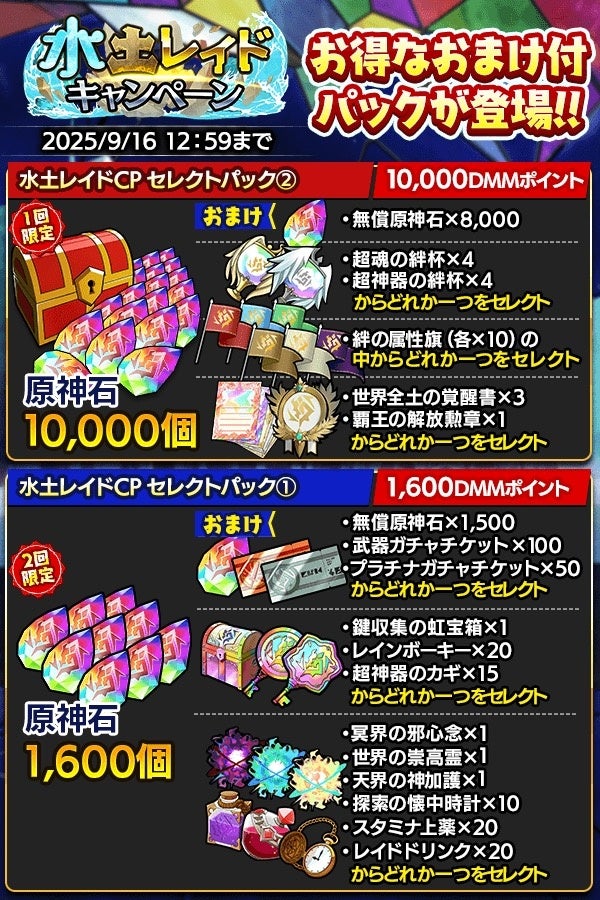 原神石に加えて、ガチャチケットや限界突破アイテムなど、お好きなアイテムを選択できる「水土レイドキャンペーンセレクトパック」が2種登場!