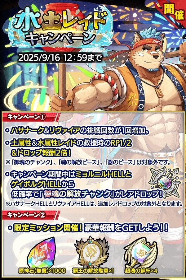 土属性&水属性の救援時のRP1/2&ドロップ報酬2倍!