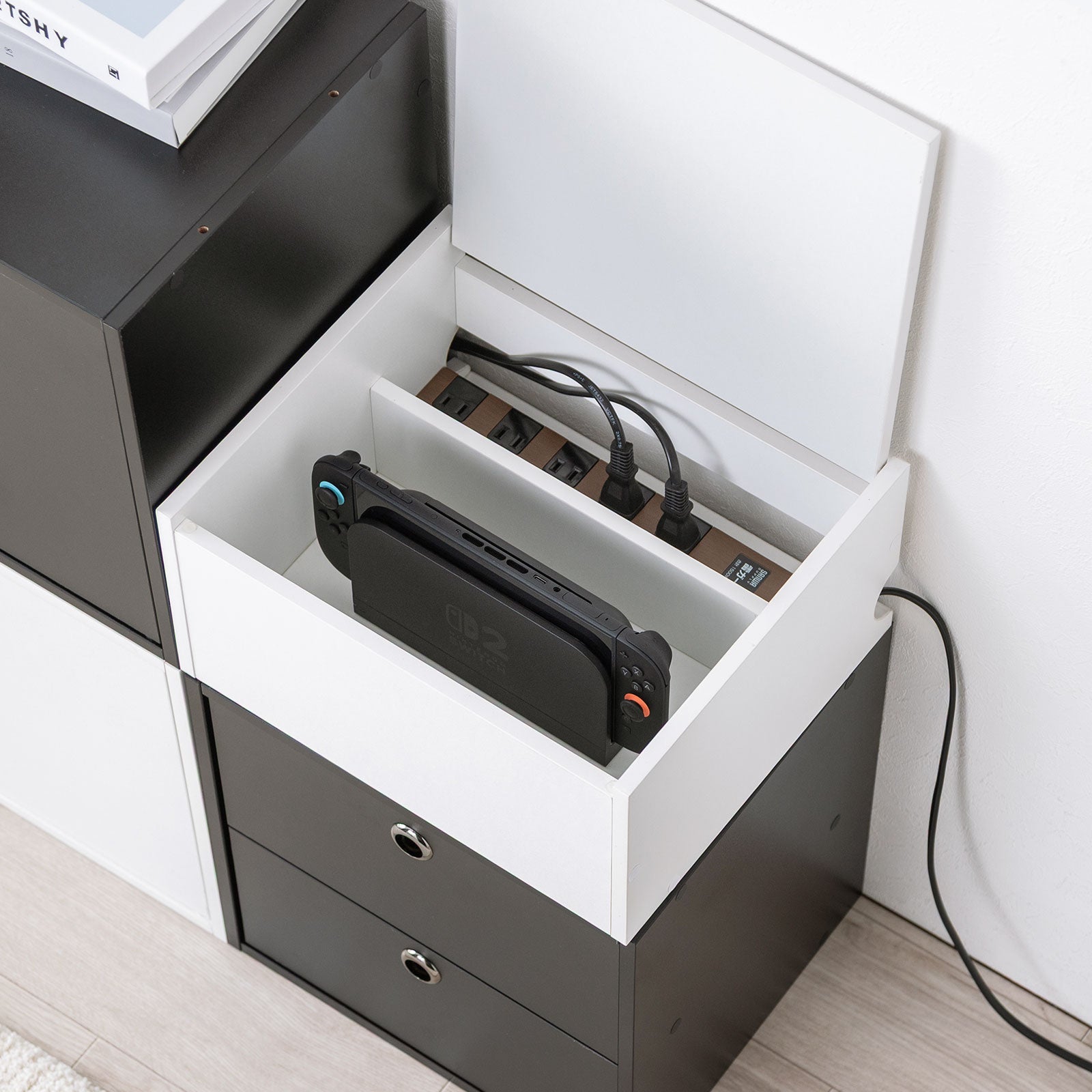 背面には配線穴を備えており、電源タップやルーターなどの周辺機器を収納しながら、配線をすっきりまとめることができます。ごちゃつきがちなケーブル類を目立たせず、生活感を抑えた美しい空間づくりをサポート。デスク周りの配線ストレスを軽減し、作業効率の向上にもつながります。 ※ハーフサイズガラス扉タイプ、引き出しタイプは配線穴がありません。
