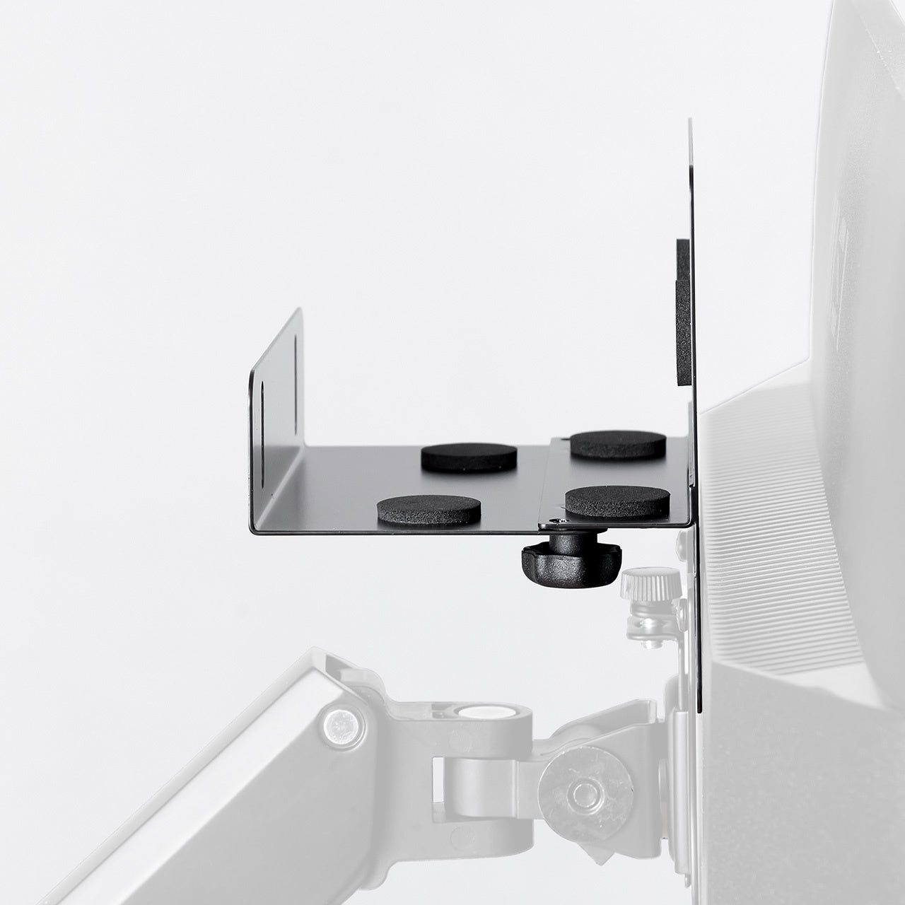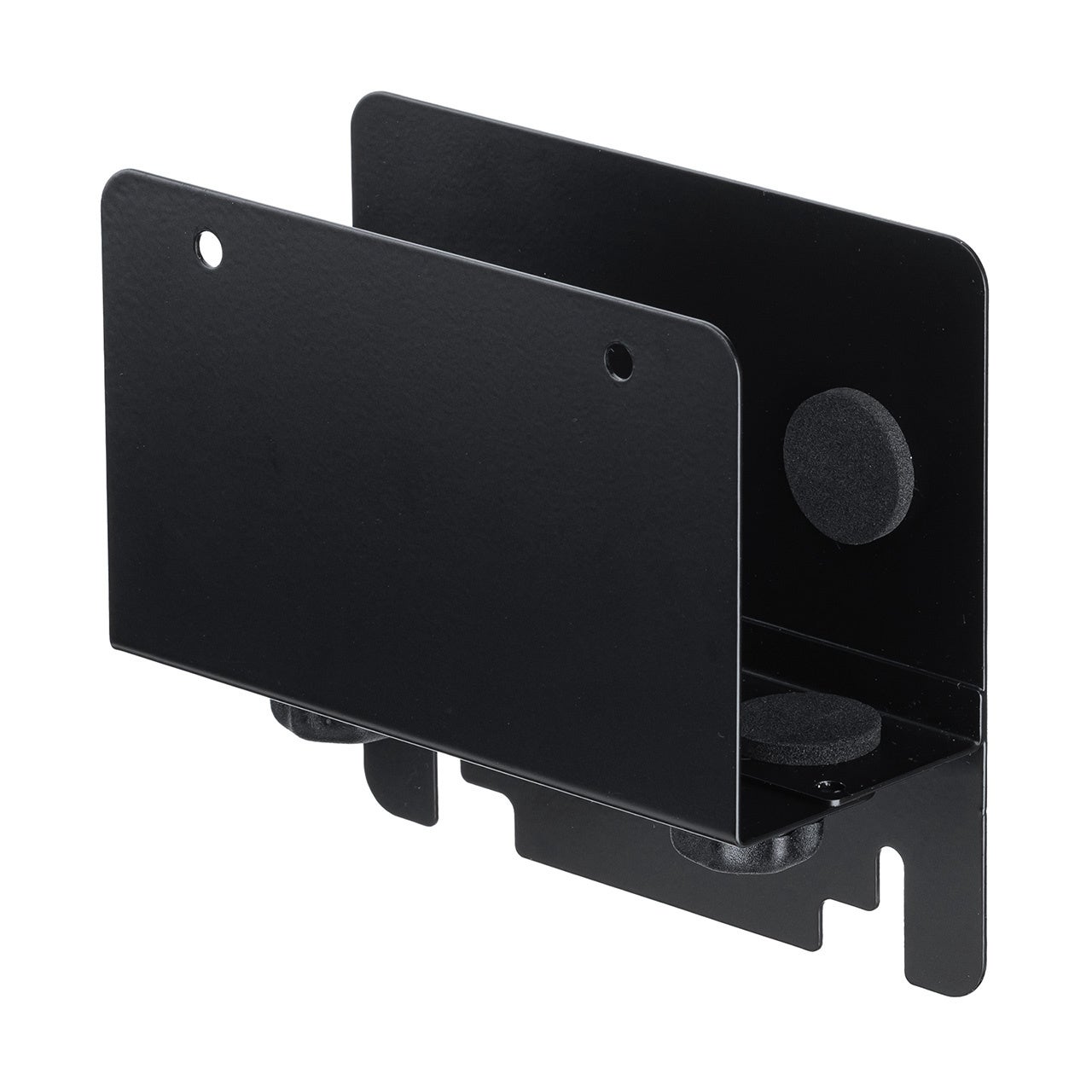 挟み込んで固定する「ホルダータイプ」と、機器を載せる「棚タイプ」の2WAY仕様。ホルダータイプは幅3.2~5.2cmまで調整可能で、機器に合わせてしっかり固定。棚タイプは幅10cmまで対応し、ドッキングステーションなど幅のある機器も安定して設置できます。