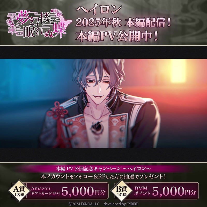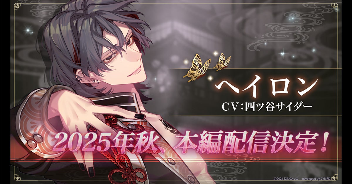 DMM GAMESを運営する合同会社EXNOA(本社:東京都港区、CEO:村中 悠介、URL:https://games.dmm.com/)は、Romanteen18シリーズの第1弾・オトナの女性向け恋愛ゲーム「夢幻楼と眠れぬ蝶」にて、ヘイロン(CV:四ツ谷サイダー)の特設ページをゲーム内にて公開したことをお知らせいたします。また、ヘイロン本編PVの公開や、公開記念のXキャンペーンが開催されたこともお知らせいたします。
