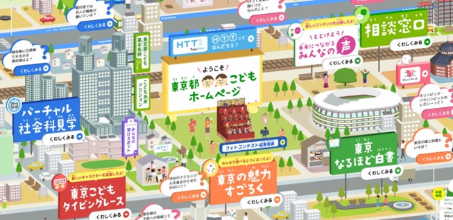 「東京都こどもホームページ」は、子供たちに楽しみながら東京の魅力や都政への関心を高めてもらうため、制作過程に子供たちが参加し、子供たちと一緒に作ったホームページです。