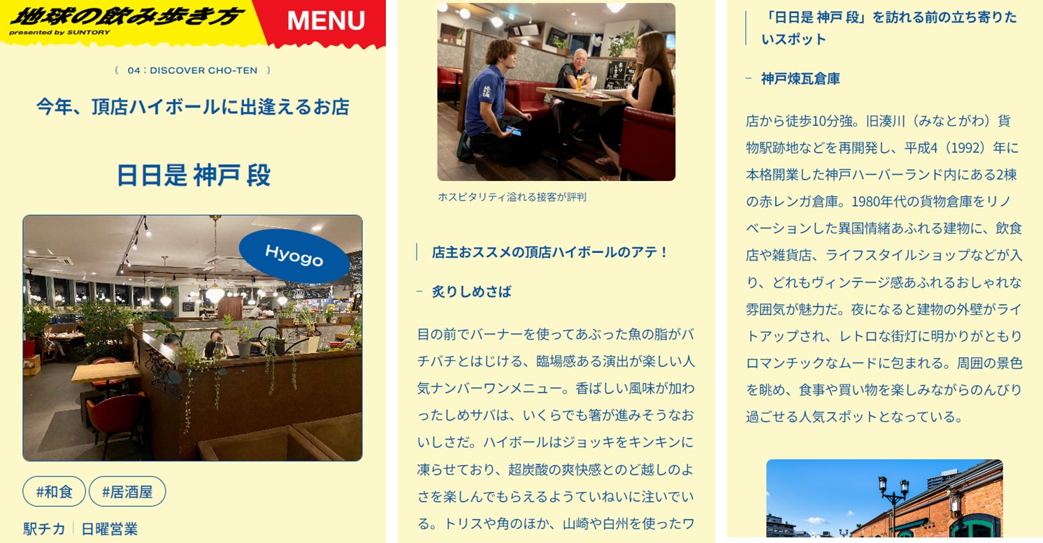 頂店ハイボールとは、サントリーが定めた7つの審査基準を満たした、ハイボールの“頂”を極めたお店だけで楽しめる最高峰のハイボール。地球の歩き方はそんな“頂店”をさらにおいしくするため、“街歩きを通して地域を知る”という要素を追加して、全国各地で頂店ハイボールを楽しんでもらいたいと考えました。特設サイトでは、おすすめ店周辺の観光を楽しんだうえでお酒を飲む楽しさを伝えていきます!
