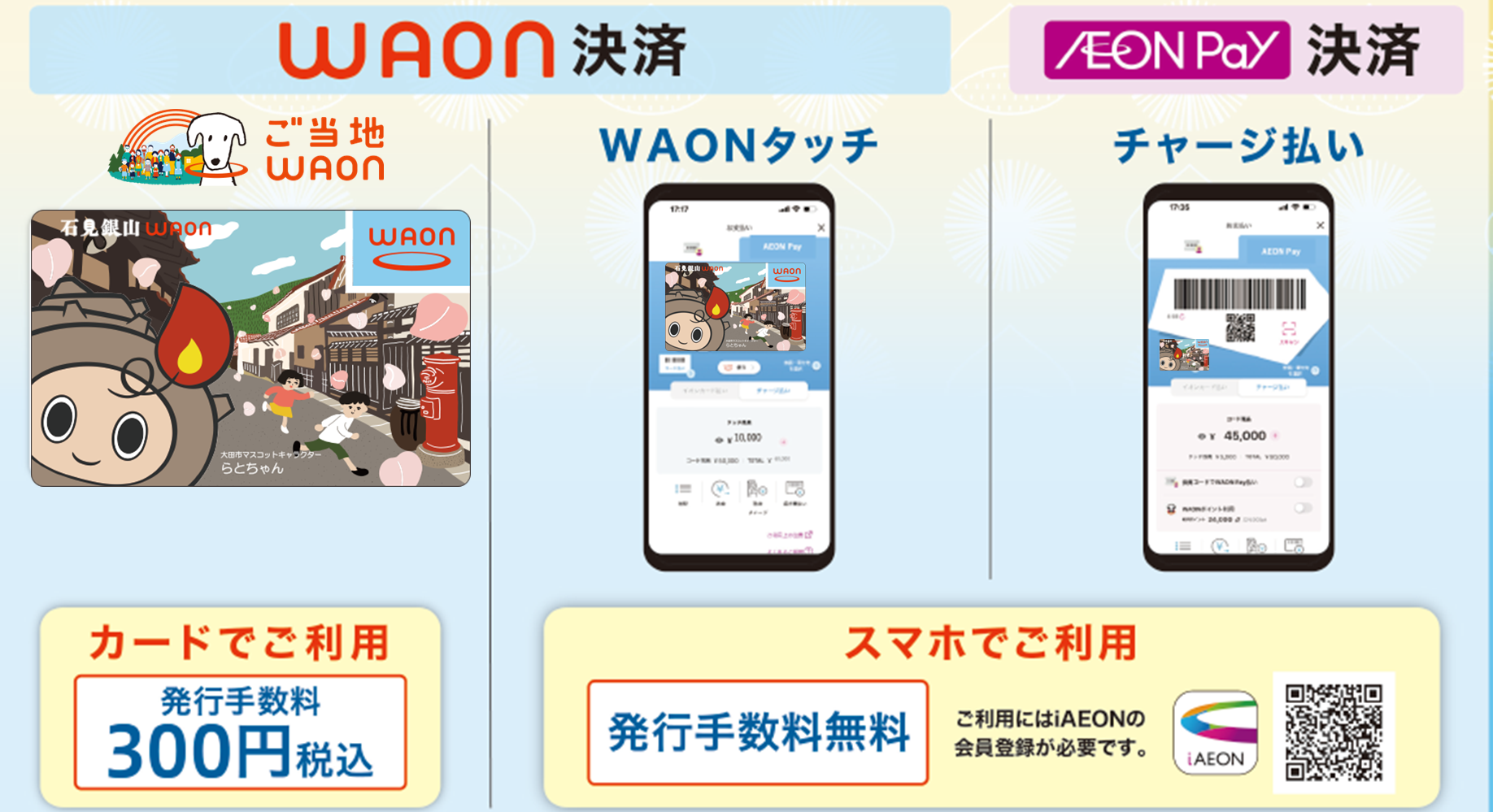(スマートフォンでのAEON PayおよびWAONの発行手数料は無料です。)