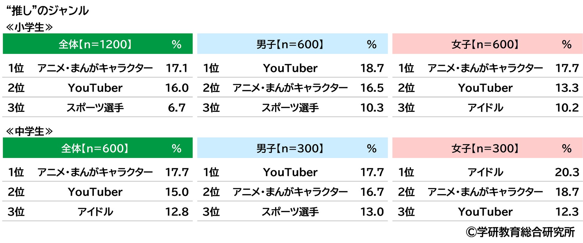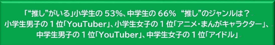 “推し”のジャンルをみると、小学生男子の1位は「YouTuber」、小学生女子の1位は「アニメ・まんがキャラクター」、中学生男子の1位は「YouTuber」、中学生女子の1位は「アイドル」でした。
