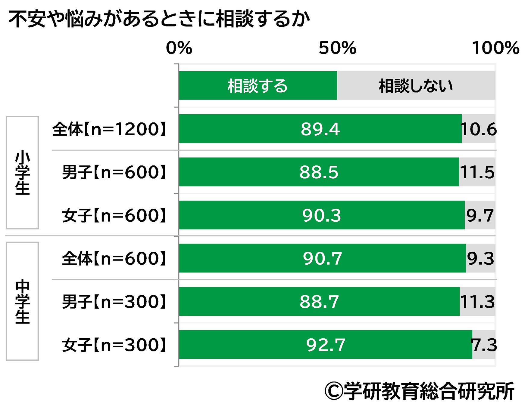 また、不安や悩みがあるときに相談するかをきいたところ、小学生では「相談する」が89.4%、「相談しない」が10.6%、中学生では「相談する」が90.7%、「相談しない」が9.3%となりました。男女・学年別にみると、「相談しない」と回答した人の割合は、小学生男子11.5%、小学生女子9.7%、中学生男子11.3%、中学生女子7.3%と、いずれも男子のほうが高くなりました。