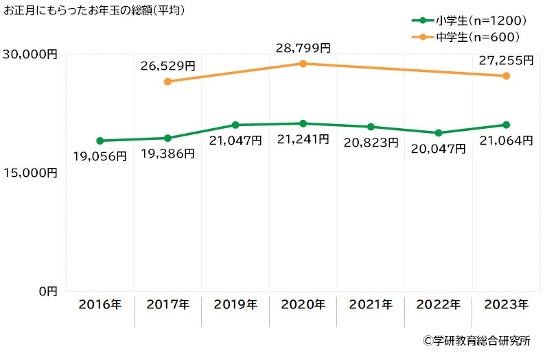 今年(2023年)のお正月にもらったお年玉の総額(すべてを足した額)をきいたところ、小学生では平均21,064円、中学生では平均27,255円でした。