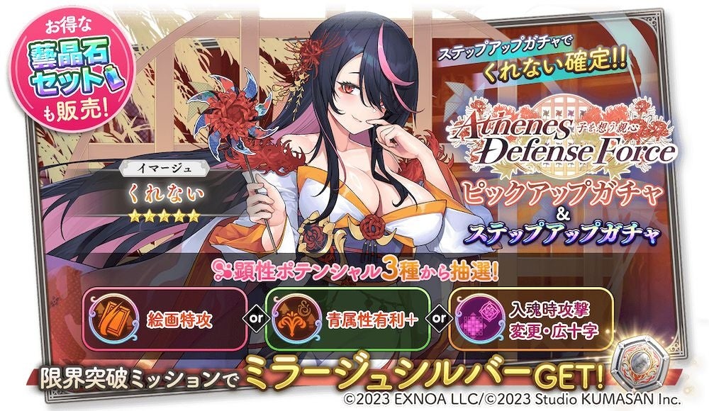 また、ステップ5にて★5イマージュ「くれない」を確実にゲットできる5ステップアップガチャも同時開催いたします。