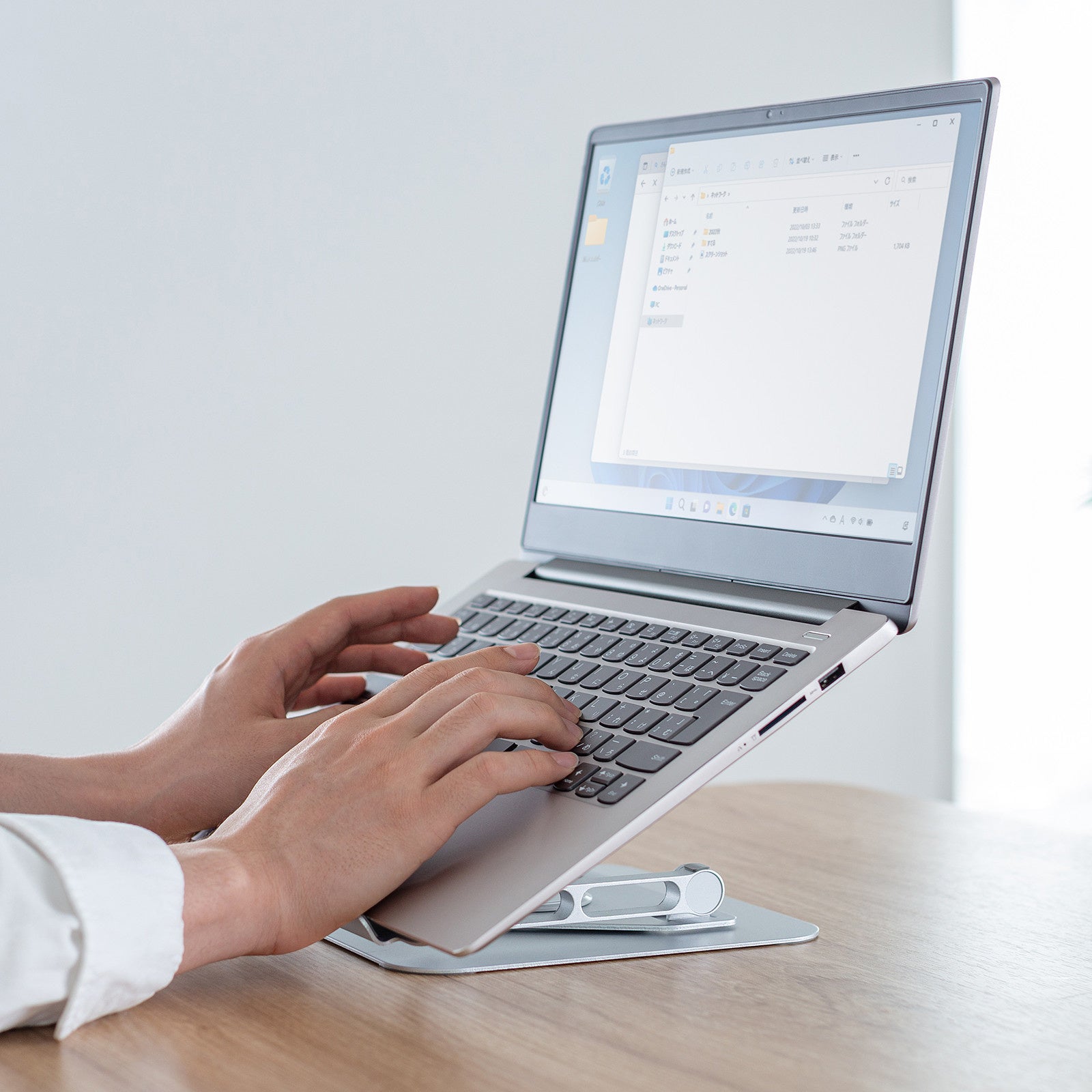 360度回転台座により、画面共有や省スペースでの利用も可能です。姿勢改善や放熱にも配慮し、長時間のデスクワークを快適にサポートします。
