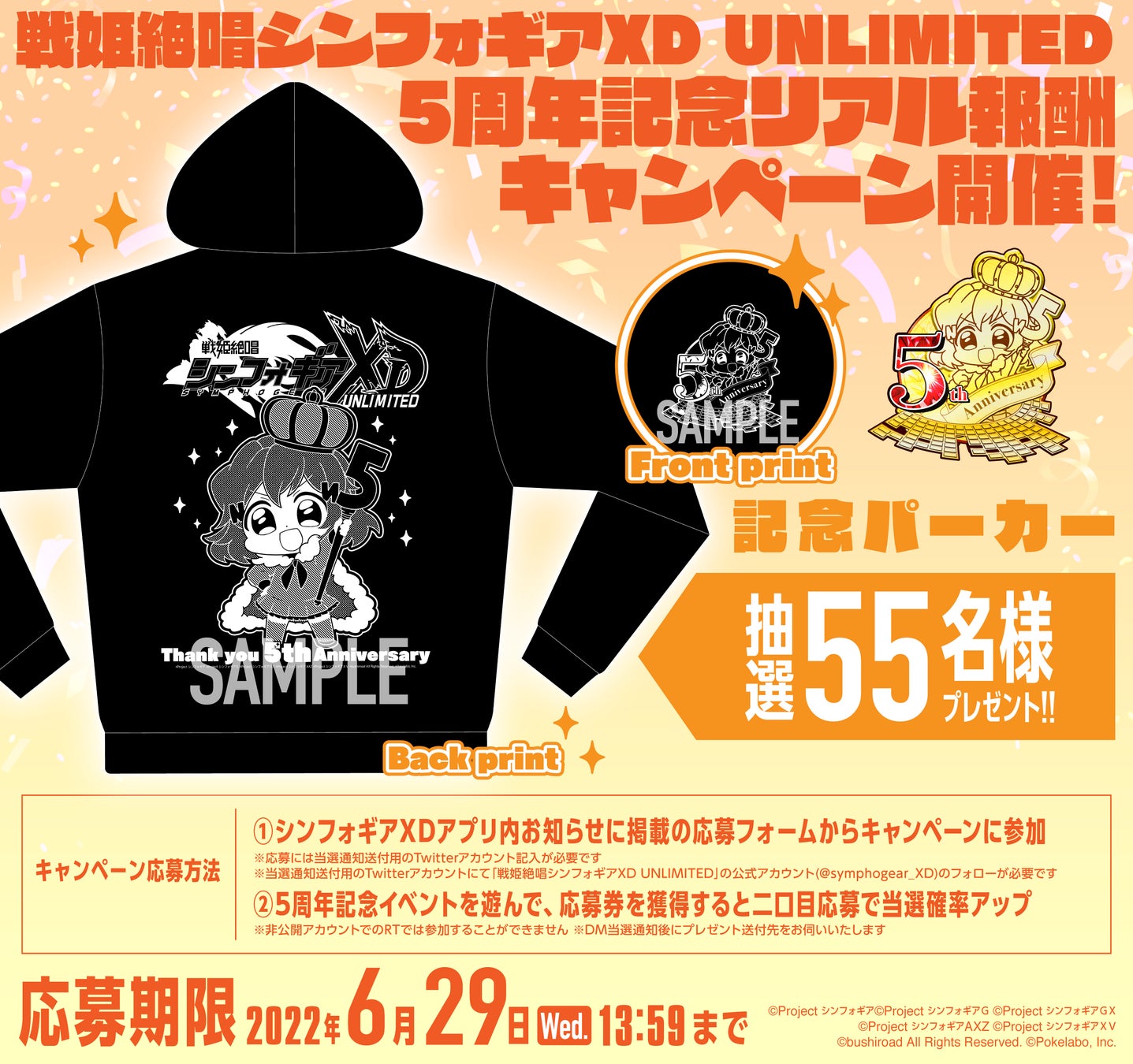 シンフォギアXDアプリ内のお知らせに掲載される応募フォームからキャンペーンに参加された方の中から抽選で5周年記念パーカーを抽選で55名様にプレゼント。