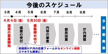 令和7年度の事業提案は、4月4日(金)から5月30日(金)までの期間で、皆様からの提案を募集いたします。今回募集した事業案については、都における審査等を経て、7月下旬から都民の皆様によるインターネット投票を実施する予定です。都民の皆様による投票結果を踏まえ、令和8年度予算案への反映を図ります。