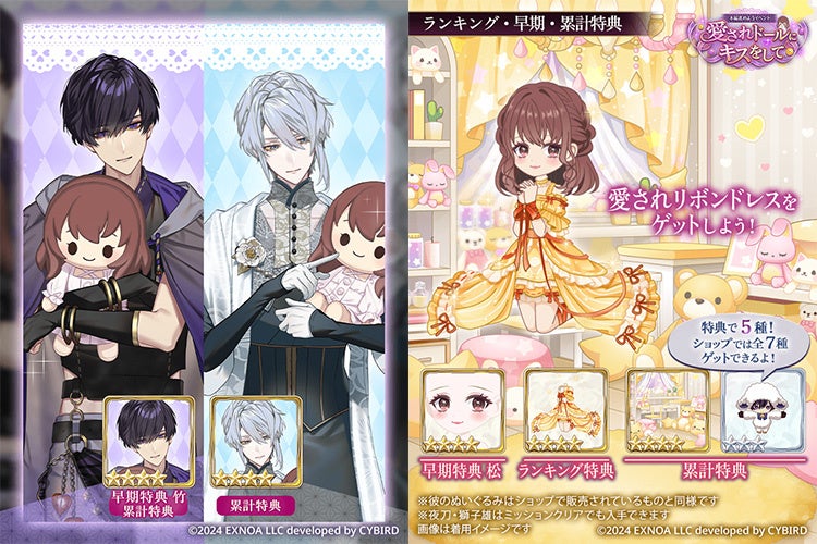 ★4【ドールのあなたを離さずに】良、★4【お姫様ドールに愛を】椿、超BIGな夜刀ぬいぐるみ、ストーリー「【全5種】愛されドールにキスをして前編」、ストーリー「【全5種】愛されドールにキスをして後編」、愛されドールなふわもこルーム、手つなぎ羊な彼のぬいぐるみ(全5種)、その他ゲーム内アイテム
