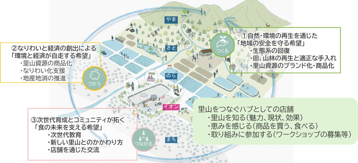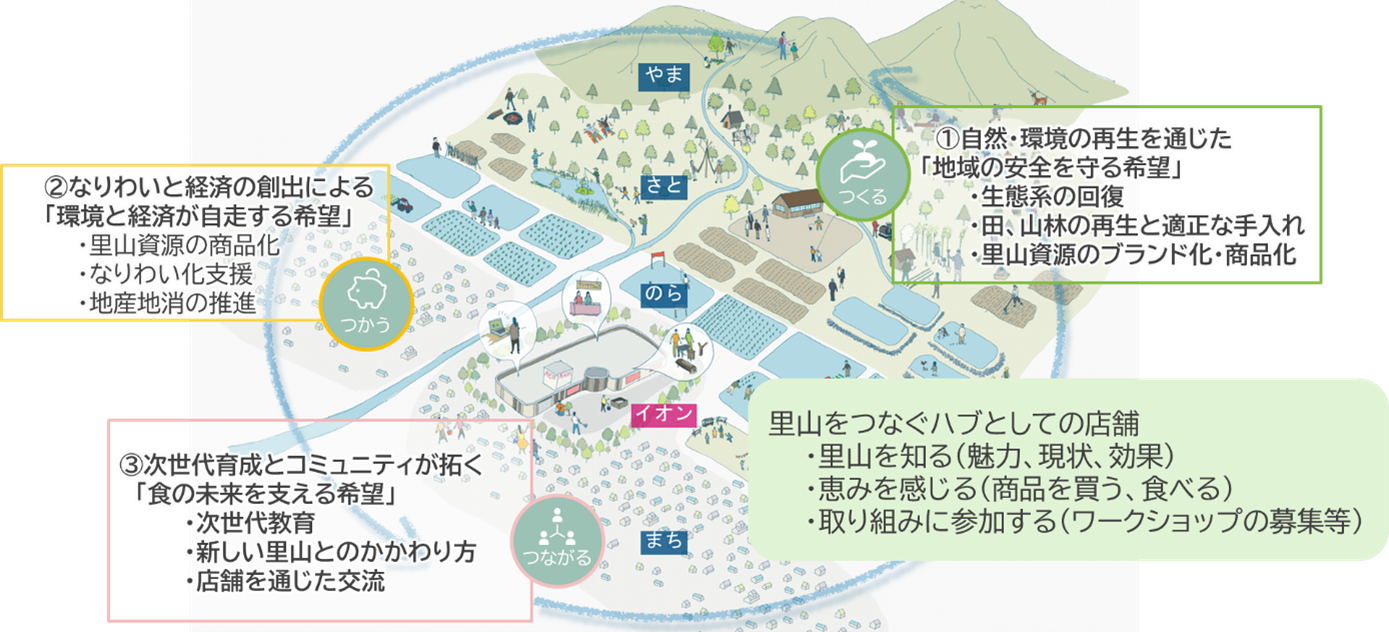 イオンは、店舗を基点に地域とともに事業を展開している企業として、地域課題の解決に継続的に関わる使命を担っています。地域の自然と人々の営みが相互に支え合い、持続的に発展する関係の構築を目指し、自然を「守る」だけでなく「活かす」ことで、地域のなりわいやコミュニティの再生につなげ、持続可能な地域モデルの構築に向けて本プロジェクトを推進します。