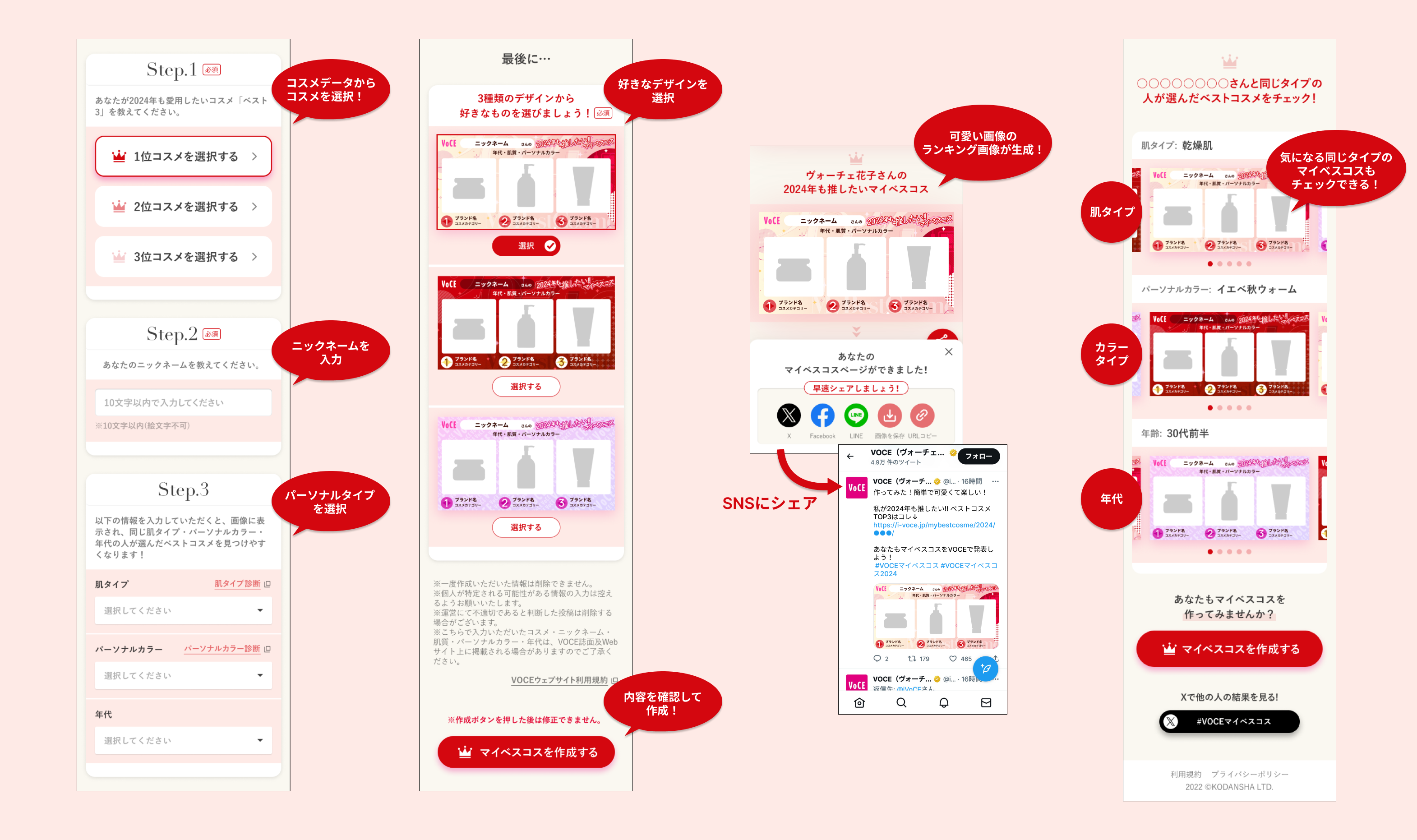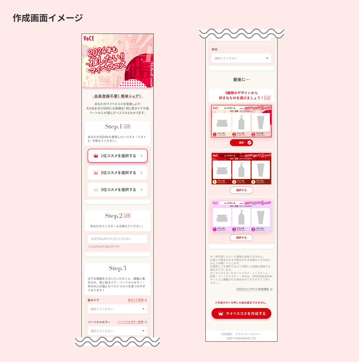 VOCEのベストコスメ発表を皆さんと一緒に盛り上がりたい!という想いと、普段からコスメについて情報発信をしていきたい”コスメ好きさん"に「コスメ愛をシェアする場」を提供していきたいという思いから、VOCE「マイベスコス」という新ツールが生まれました。誰でも感覚的に作れて、簡単に自分の「推しコスメ」を可愛くまとめられるサービスです。