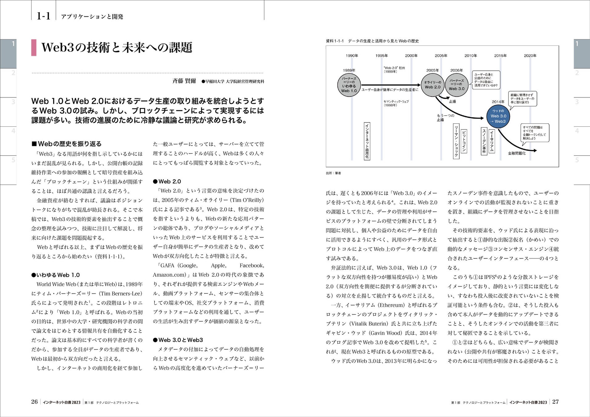 新しい話題として注目が集まったWeb 3においては、その技術要素の解説や、重要概念であるDAOに関して制度改革面から考察し、ムーブメントの背景にある基本的な考え方を読むことができます。さらに、最新刊2024年版『インターネット白書2024 (副題:AI化する社会のデータガバナンス)』でも複数の専門家が解説している生成AI(本号ではジェネレーティブAI)については、この2023年版で初めて取り上げています。