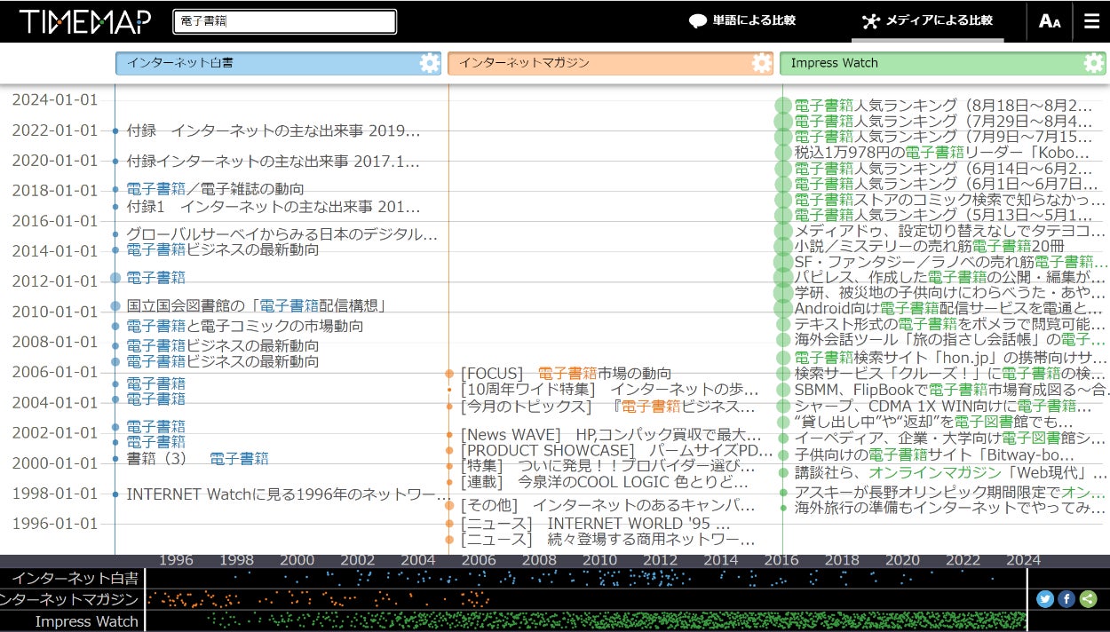「インターネット白書ARCHIVES」では、時系列検索エンジンTIMEMAPを採用。キーワード検索をすると、27号分のインターネット白書の記事および統合した月刊誌『インターネットマガジン』のバックナンバー記事などが年表形式で表示されます。1994年以降のインターネットの歴史を無料で読めるこのアーカイブスを、仕事や勉強にぜひご活用ください。