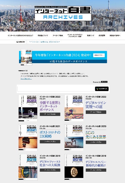 「インターネット白書ARCHIVES」(インターネット白書アーカイブス)は、インターネットの黎明期(1996年)からの歴史を年鑑として発行し続けている「インターネット白書」のバックナンバーをデジタル化し、無料で検索・閲覧できるようにしたWebサービスです。発行後1年を経過した「インターネット白書」をアーカイブスに登録しています。昨年5月には、1994年から2006年までインプレスより発行していた月刊誌『インターネットマガジン』のバックナンバー検索サービスを統合し、より多くの記事が検索できるようになりました。