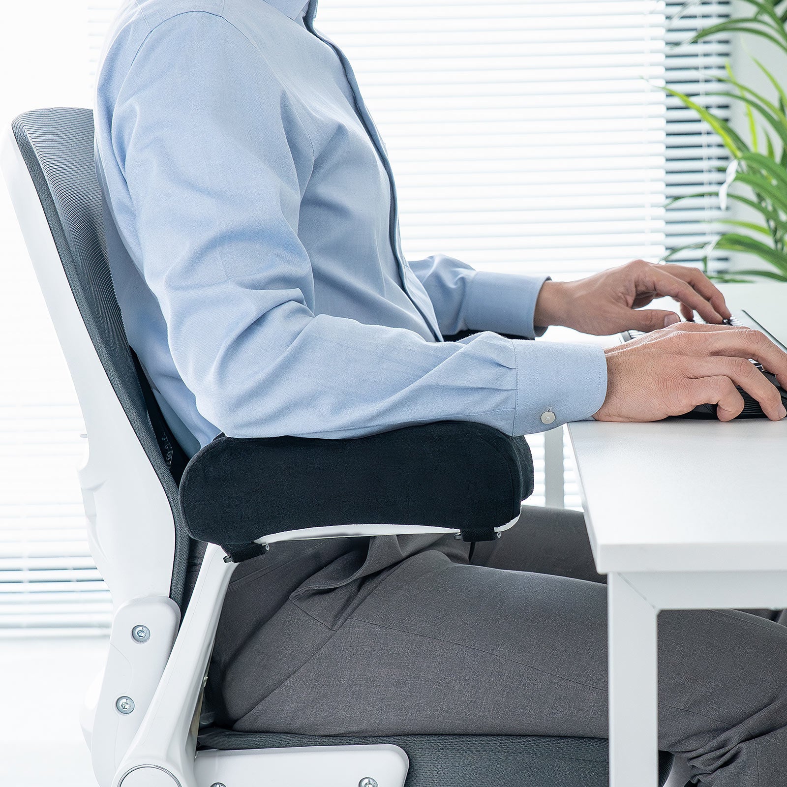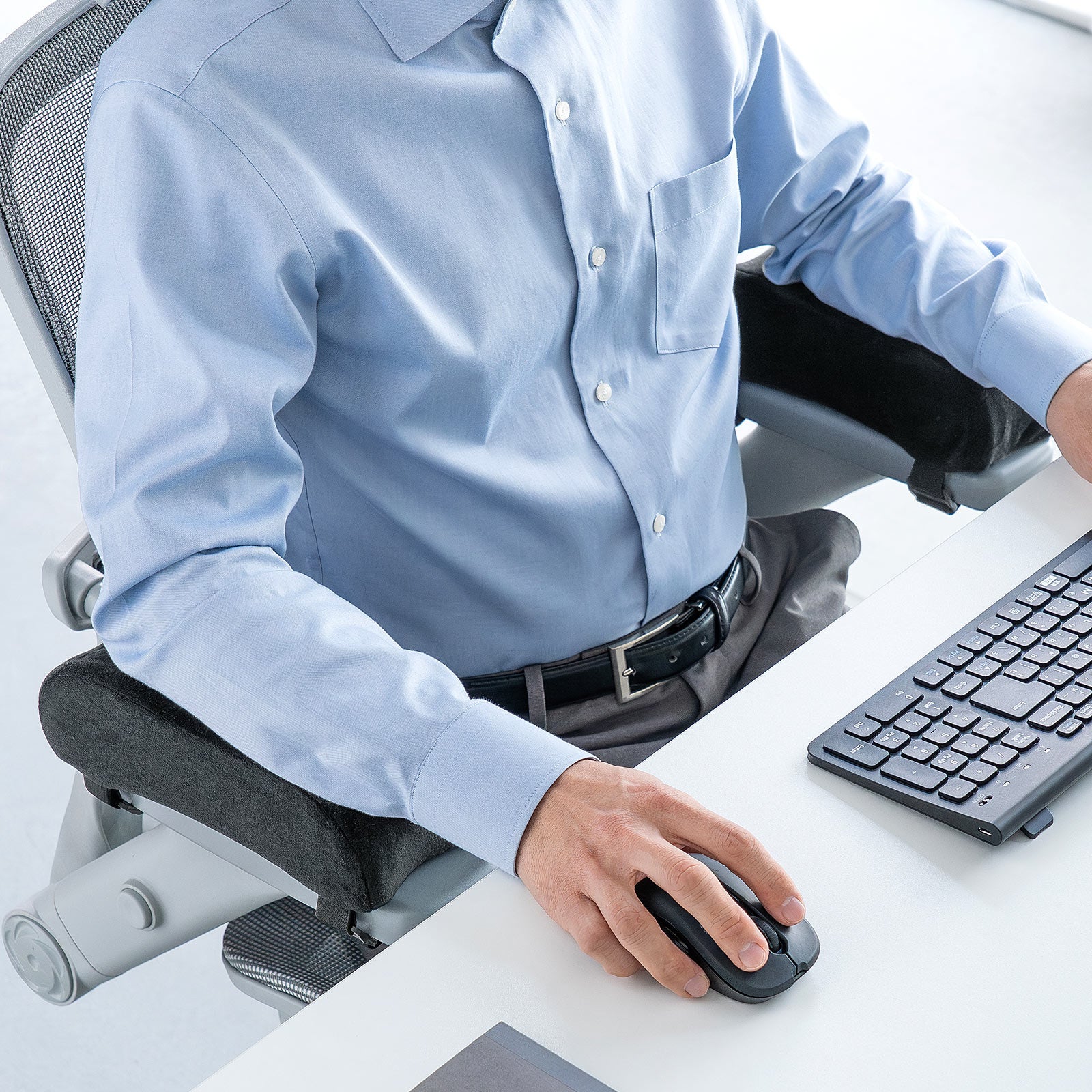 ちょうどいい硬さに調整された低反発ウレタンが、腕を置いたときの圧力を分散。肘や前腕への負担を吸収し、長時間作業でもリラックスした姿勢をキープできます。前腕が安定することで、タイピングやマウス操作もスムーズになり、集中力の持続にもつながります。