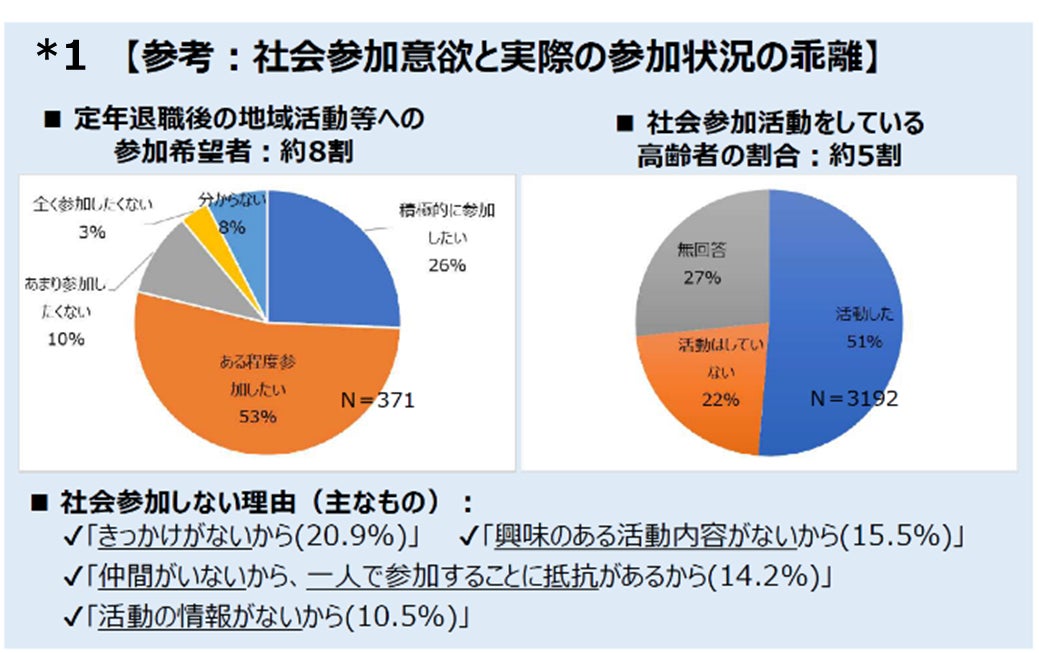令和元年度在宅高齢者の生活実態調査、令和2年度インターネット福祉保健モニター「高齢期における地域活動等の意向」においては、シニア・プレシニアの社会活動等への参加希望は約8割あるものの、実際の社会参加は約半数にとどまっており、その理由として、きっかけがない、興味のある活動内容や活動情報がない等の理由があげられました。*1また、令和4年7月の区市町村向けアンケートにおいては、シニア・プレシニアと社会参加活動のマッチング事業について約7割弱が実施していないという結果でした。