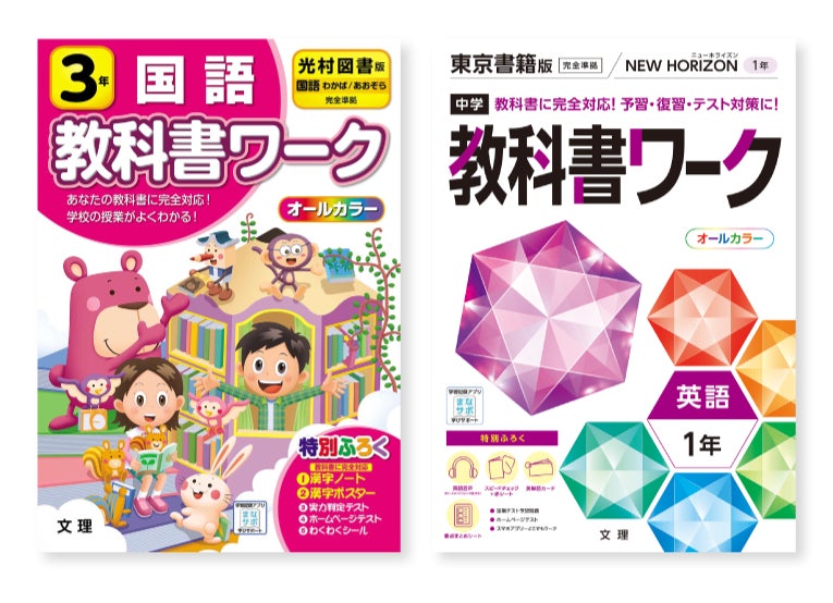 『小学教科書ワーク』と『中学教科書ワーク』があり、家庭でも教科書に沿った内容で学習できる、“教科書準拠”の学習参考書です。