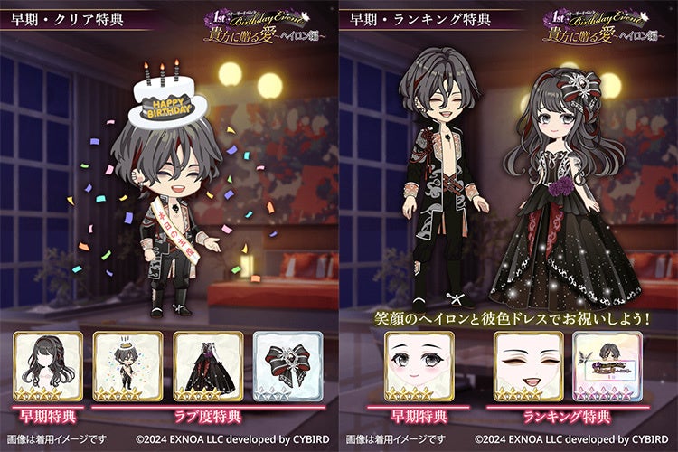 ★4【貴方に贈る愛-ラブ-】ヘイロン、「1st Birthday Event 貴方に贈る愛~ヘイロン編~」特別ストーリー、スチル【貴方に贈る愛-ラブ-】ヘイロン、1stBD ヘイロンカラーのヘアアクセ、1stBD 本日の主役ミニキャラ(ヘイロン)、1stBD ヘイロンカラーのお祝いドレス、その他ゲーム内アイテム