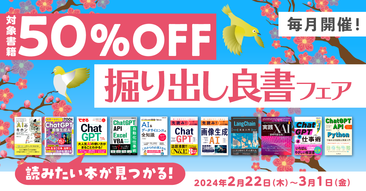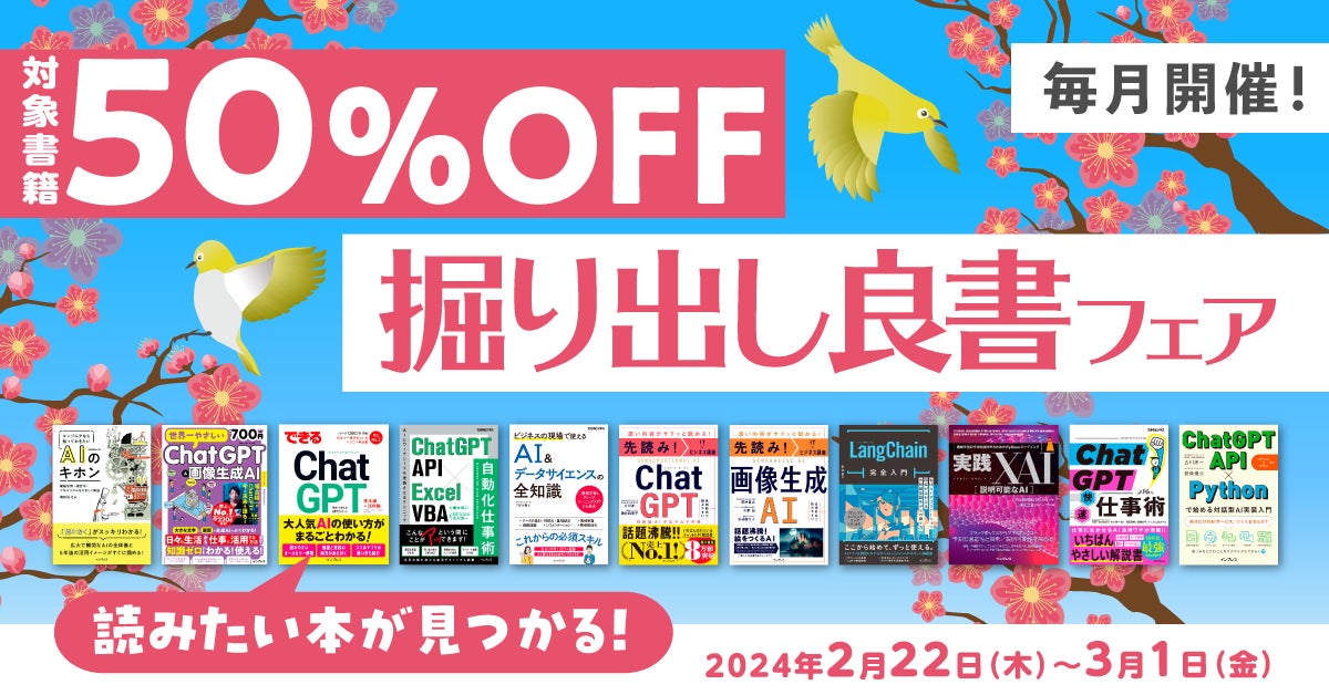 2月開催のフェアではAI技術に関連するタイトルをラインナップ。ChatGPTや画像生成AIなど、今後さらに重要になっていく最新技術を学べます。