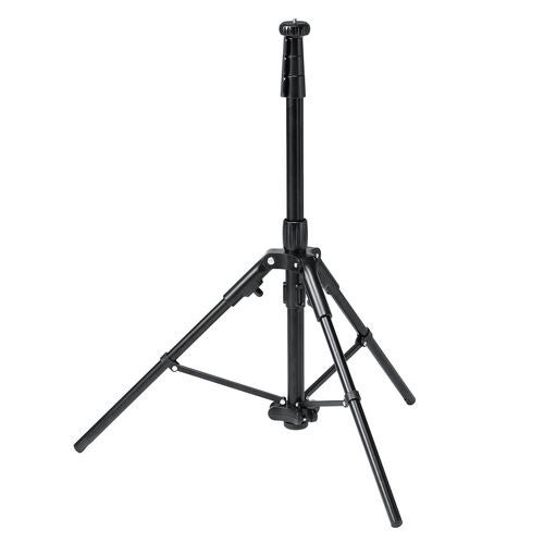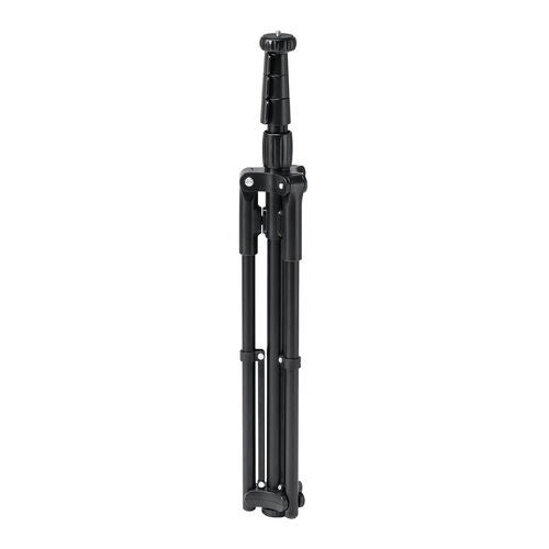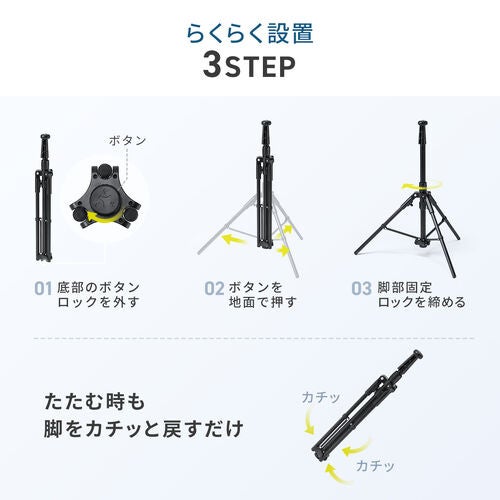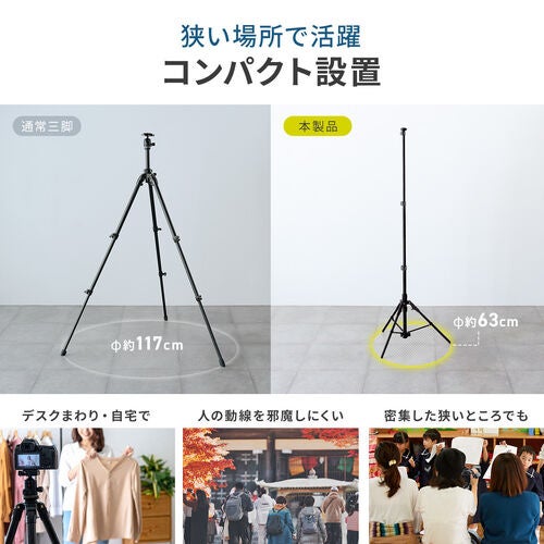 本製品最大の特長は、中央の支柱を押し下げるだけで3本の脚が同時に展開する独自の自動開脚機構である。一般的な三脚のように脚を一本ずつ手で広げる手間が一切なく、ワンタッチに近い感覚で撮影体制を整えられる。シャッターチャンスを逃したくない屋外撮影や、急なWeb会議での設置・撤収において圧倒的なスピードを実現する。