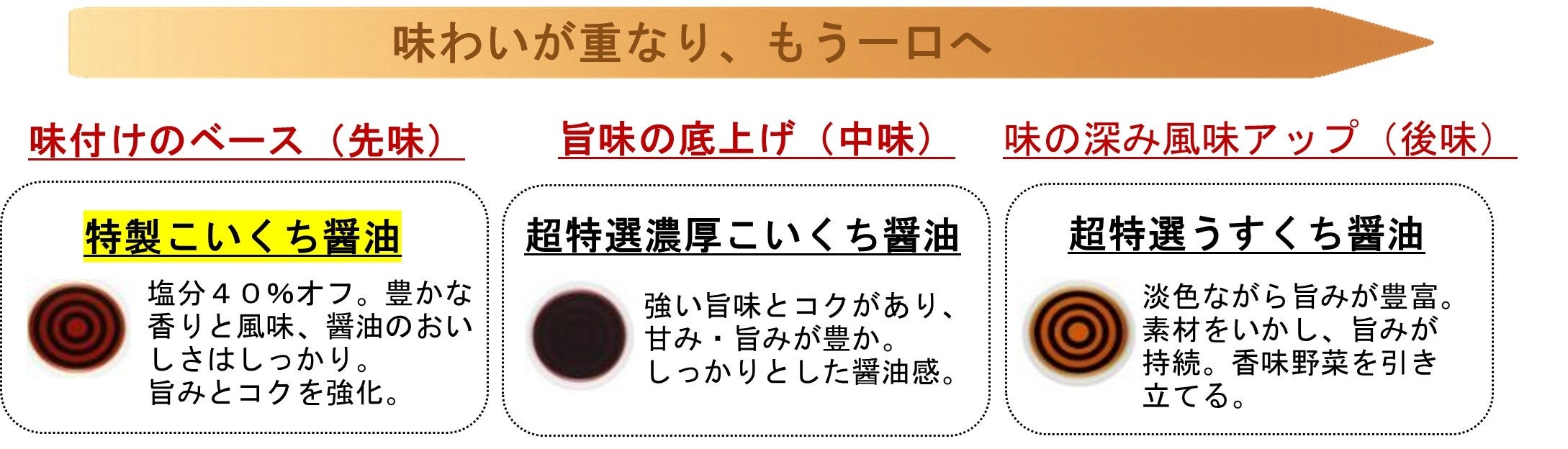 従来の3種の醤油の良さをいかしつつ、配合の見直しと一部種類の入れ替えを行い醤油の風味がより際立つ味わいへと整えました。「特製こいくち(減塩醤油)」は、配合量を増やし先味の立ち上がりを強化。中味には「超特選濃厚こいくち醤油」を用い、コクと旨みのある醤油感を付与しています。さらに後味には「超特選うすくち醤油」を効かせ、旨みを底上げ。3種の醤油の特長や機能を調和することで、先味・中味・後味にストーリー性が生まれ、“もう一口食べたくなる味わい”を実現しました。