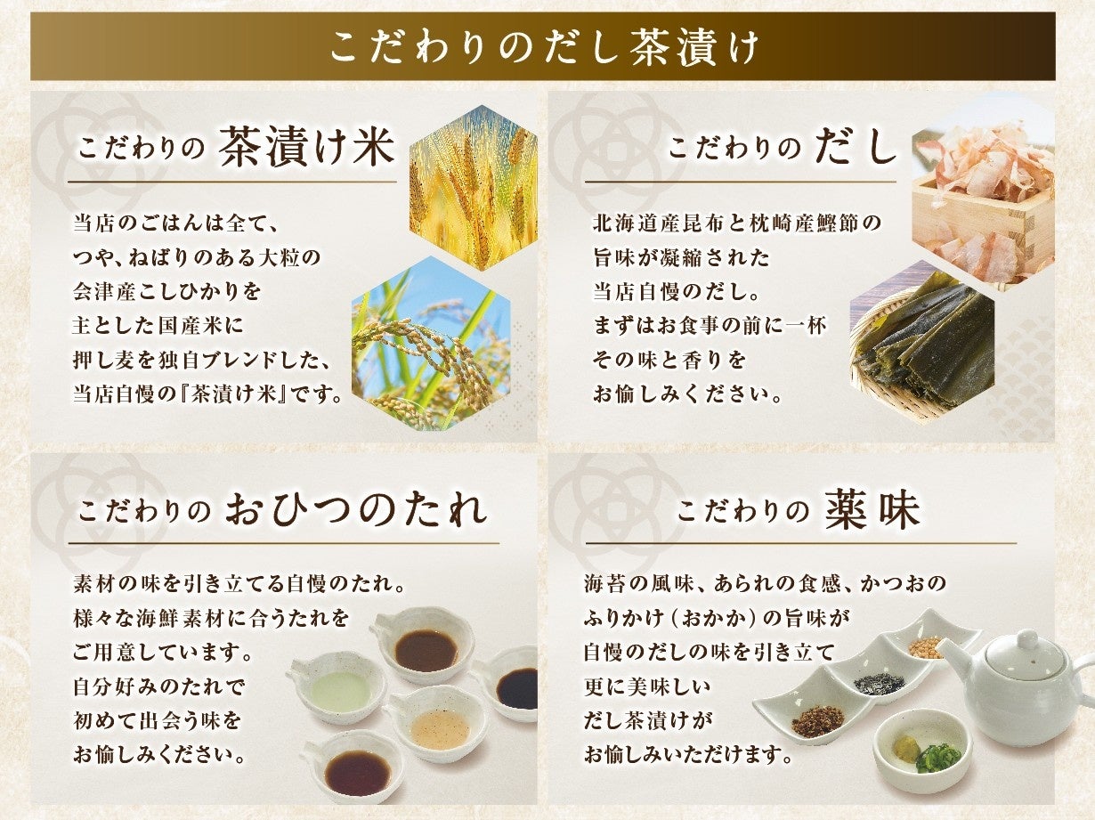 メニューにつきましては、お客さまが“自分流のおひつごはん”をよりカジュアルに楽しめるよう、従来のおひつごはんオリジナルタレに加え、バジルチーズソースや海老みそソースなど、その日の気分やお好みにあわせて選べる5種類のタレをご用意、さらに“だし茶漬け”に欠かせない薬味として定番の刻み海苔やあられに加え、特製だしの旨味を一層引き立てる「おかか」を新たに取り入れることで、味の広がりや奥行きをお好みでアレンジいただけます。今回のリニューアルを通じて、“だし茶漬け”の新たな愉しみ方に加え、和カフェとしての利用価値を高めることで、日常のお食事からティータイム、特別な日まで、さまざまな場面でご利用いただける利便性の向上を図るとともに、心地よい時間と食体験の提供に努めてまいります。