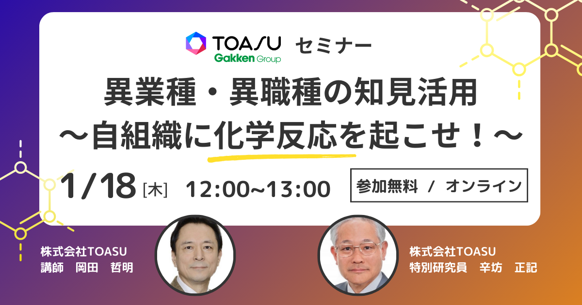 【参加無料セミナー】株式会社TOASU、越境学習をテーマとした「異業種・異職種の知見活用 ~自組織に化学反応を起こせ!~」を1月18日ランチタイムに開催。