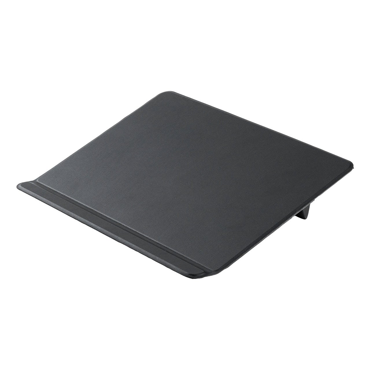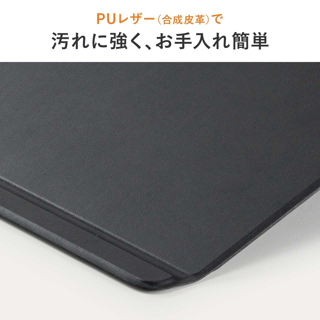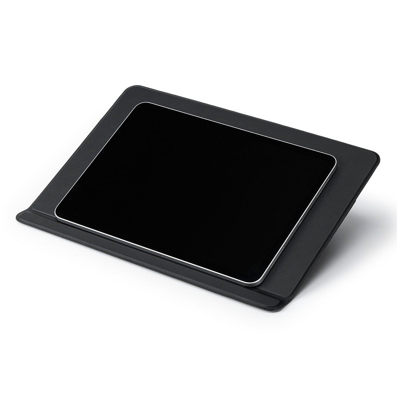 表面素材には、肌触りが良く高級感のあるPUレザーを採用しました。ソフトな質感ながら、使用時にはタブレットやPCをしっかりと支える十分な強度を備えています。機器と接触しても傷がつきにくく、また滑り止め効果もあるため、粘着剤などを使わずに置くだけで安定した設置が可能です。
