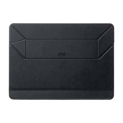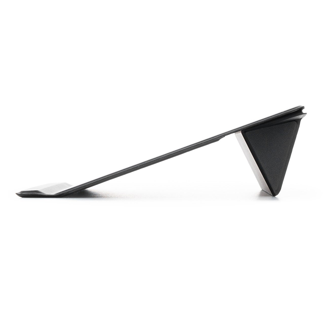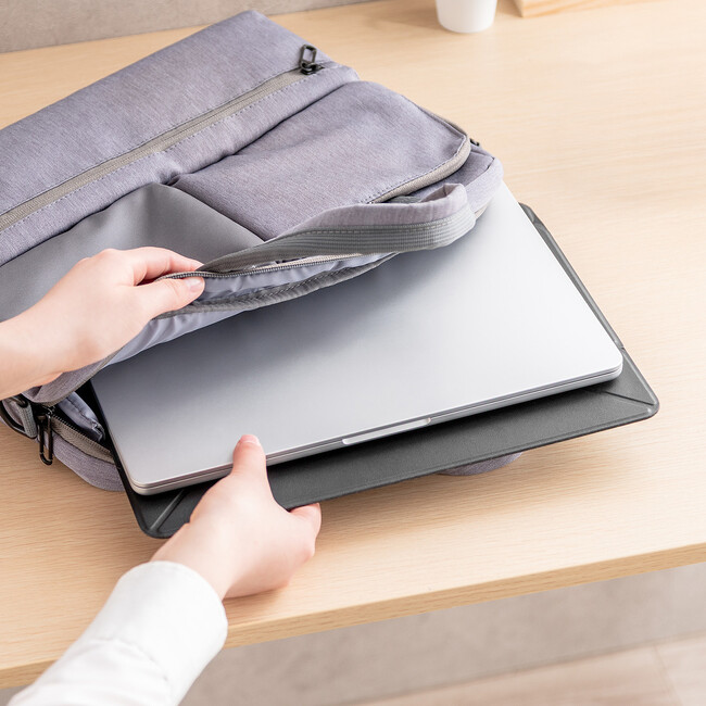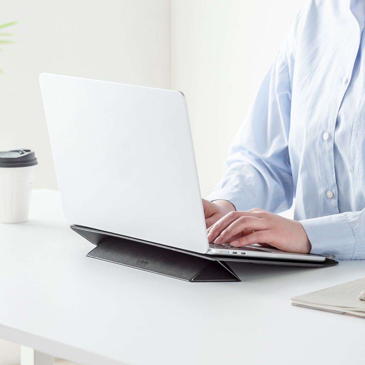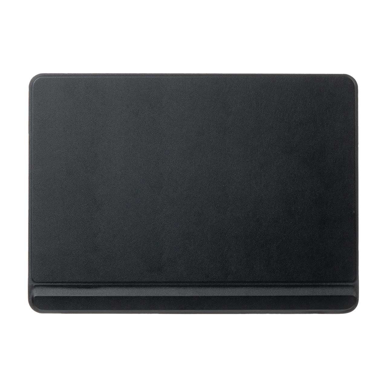 表面素材には、肌触りが良く高級感のあるPUレザーを採用しました。ソフトな質感ながら、使用時にはタブレットやPCをしっかりと支える十分な強度を備えています。機器と接触しても傷がつきにくく、また滑り止め効果もあるため、粘着剤などを使わずに置くだけで安定した設置が可能です。