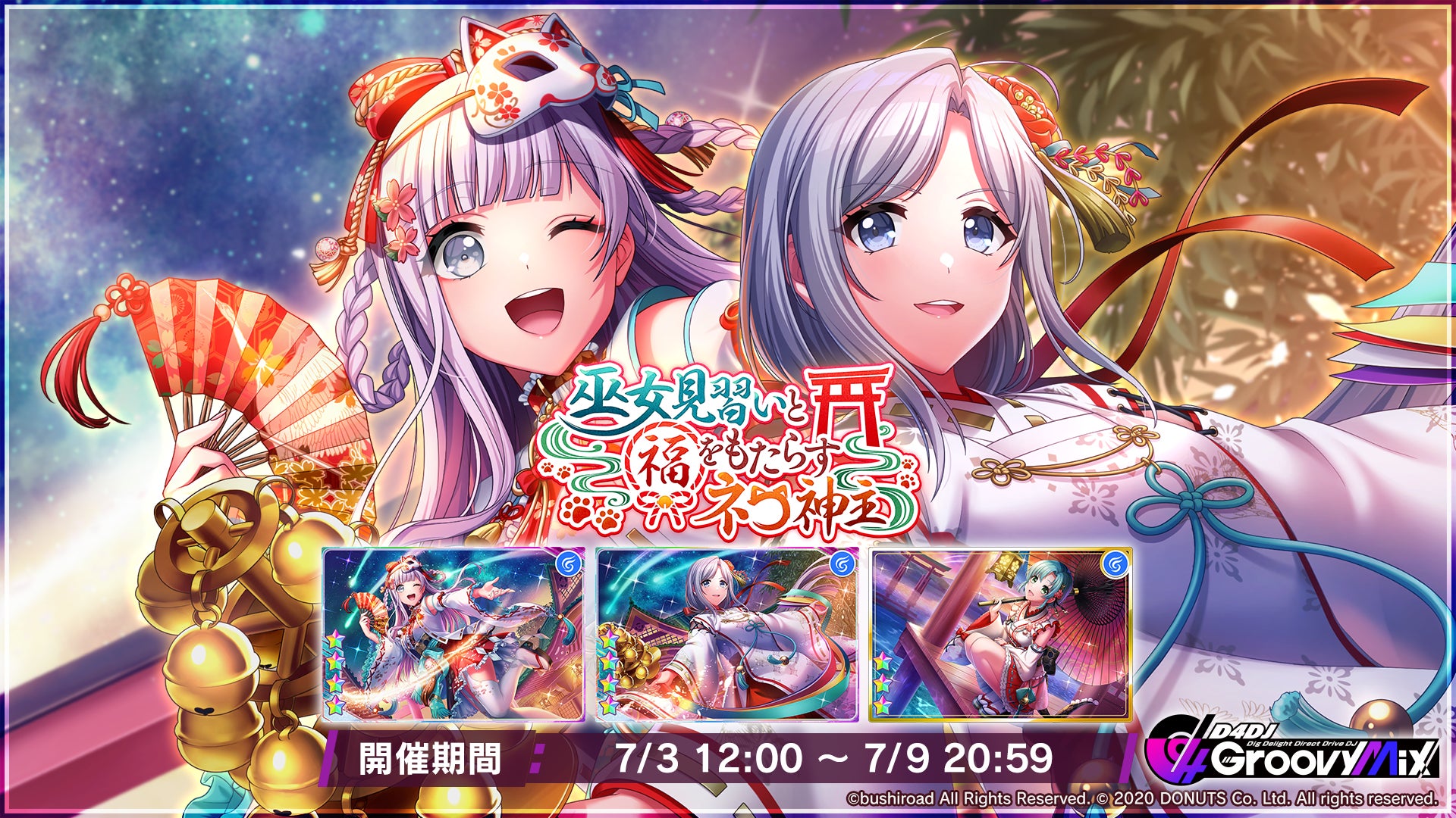 スマートフォン向けリズムゲーム「D4DJ Groovy Mix」イベント&ガチャ「巫女見習いと福をもたらすネコ神主」開催!