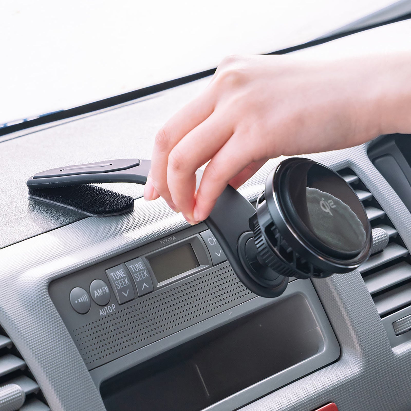 着脱式パッドには面ファスナーを採用し、ダッシュボードなどの平滑面にしっかり固定可能。使わないときは簡単に取り外せるため、車内への負担や日焼け跡を抑えられます。Qi2非対応スマートフォンでも付属アクセサリーで使用でき、幅広いユーザーに対応します。