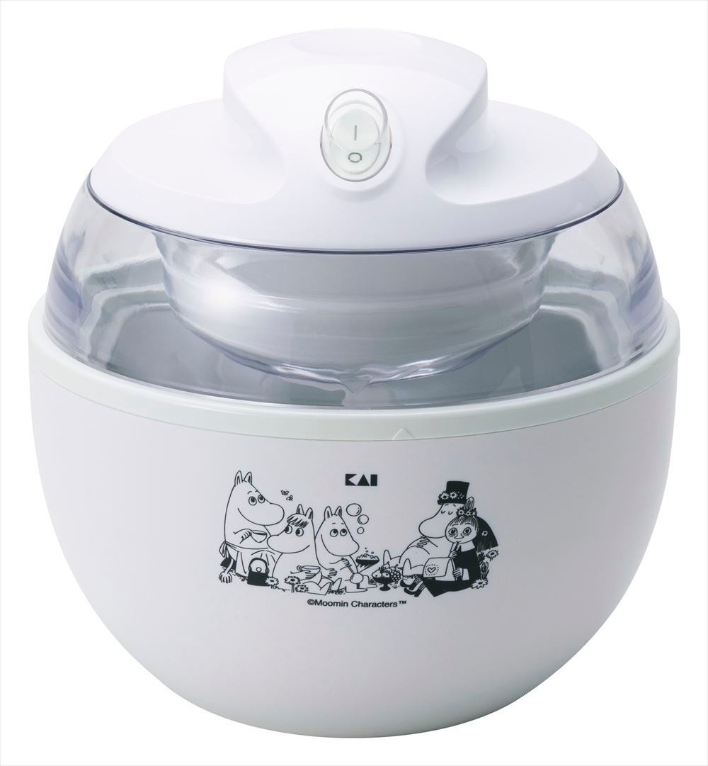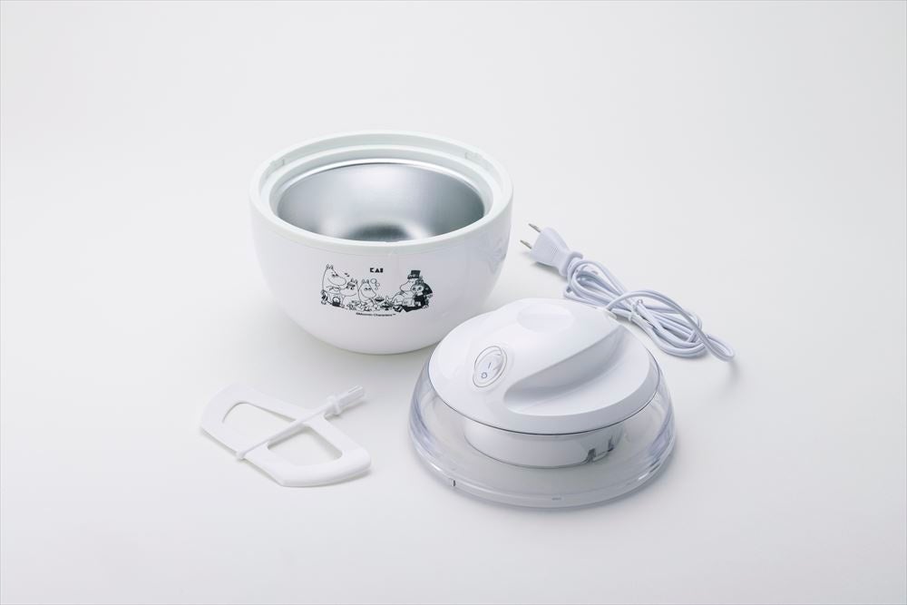 くつろぐムーミンキャラクターがプリントされたコンパクトサイズのアイスクリームメーカー。