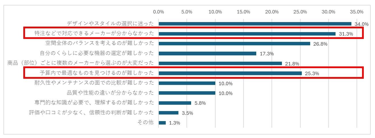 パナソニック ハウジングソリューションズが2024年6月にリフォーム・リノベーション経験者に実施した調査(インターネット、n=400)によると、「(ぴったりおさめるため)特注対応ができるメーカーがわからなかった」が31.3%、「予算内で最適なものを見つけるのが難しかったが」25.3%と上位にあげられました。