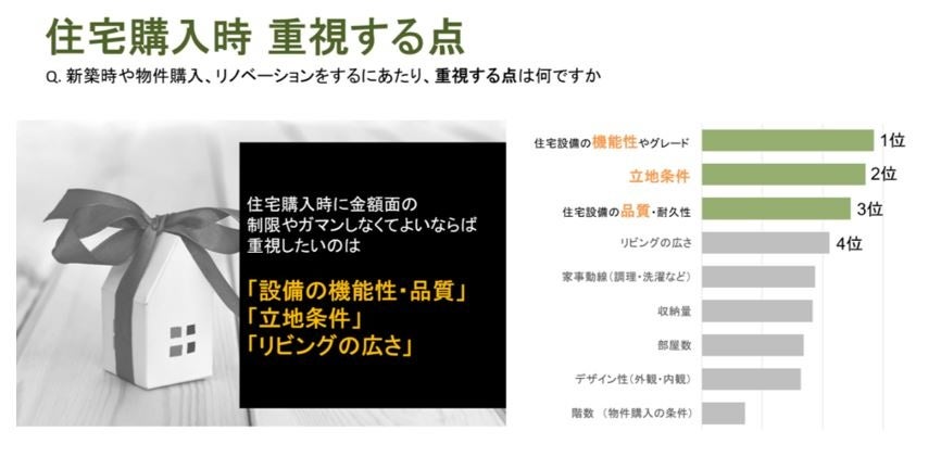 パナソニック ハウジングソリューションズが2023年10月に都市圏において3年以内に新築購入・リノベーションを検討した30-50代男女を対象に実施した調査(インターネット、n=400)によると新築時や物件購入、リノベーション時に重視するポイントとして設備の機能性や品質が高くあげられました。